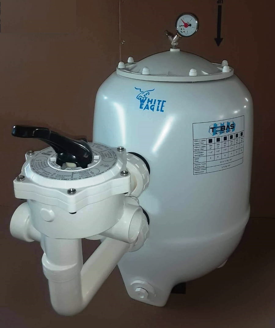 Filtr piaskowy do basenu Tebas White Eagle to najlepszy na rynku, filtr poliestrowy z klasy Premium do basenów kąpielowych. Filtr wykonany z poliestru, wzmocnionego włóknem szklanym, zapewniającym sztywność konstrukcji. Produkowany w fabryce, pod nadzorem polskich specjalistów. Ręczna metoda wytwarzania gwarantuje wysoką jakość, niską cenę, funkcjonalność i długie działanie. Zastosowany zawór 6-drogowy cechują się dużą trwałością, bez pęknięć i przepuszczania wody. Zbiornik filtra oferowany jest z zaworem bocznym w bezpiecznym opakowaniu. Wykonana z PP pokrywa filtra jest przykręcana do gwintów wtopionych w korpus zbiornika. Filtr może być montowany przy basenach z wodą słoną. Ciśnienie pracy 0,5 – 1,5 bar. Wymiana złoża piasku, co 2-3 lata, a AFM, co 8-10 lat. Przed montażem należy dokręcić elementy wewnątrz zbiornika. Mogą się one poluzować w trakcie transportu .