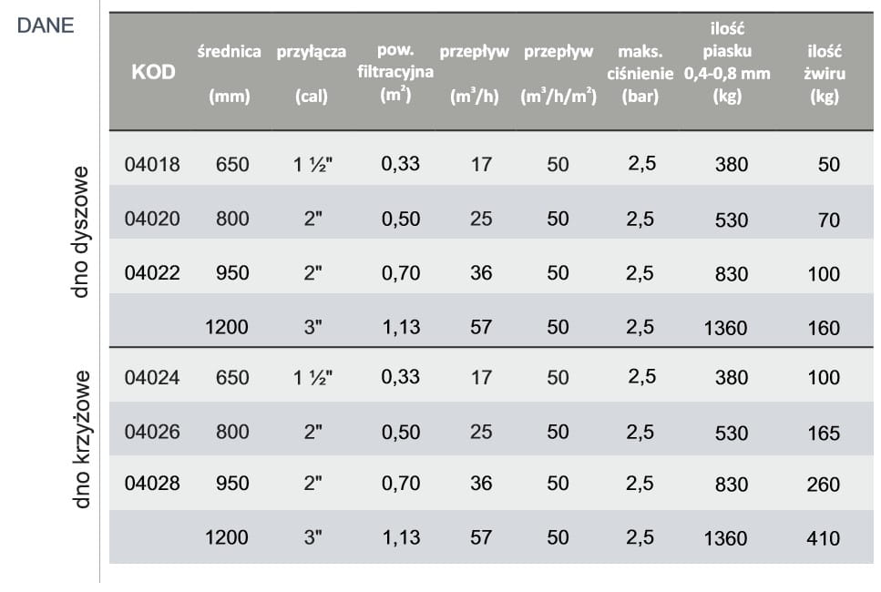 Zbiornik wykonany z żywicy poliestrowej, wzmocnionej włóknem szklanym, laminowany. Złoże filtracyjne: 1 m. Kolor filtra: RAL5015. Dno krzyżowe. Pokrywa górna i właz boczny: Ø200 mm. Maksymalne ciśnienie: 2,5 bar.